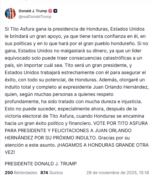 Trump, quien está en su segundo mandato como mandatario de EE. UU., sorprendió con dos posteos entre el 26 y 28 de noviembre en los que solicitó al pueblo hondureño votar por el candidato de derecha Nasry Asfura.
