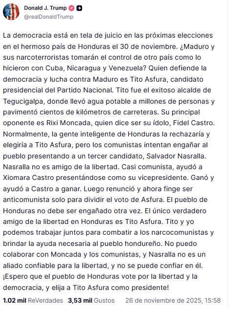 Ese día y a esa hora, Trump pidió en sus redes a los hondureños votar por Tito Asfura, al mismo tiempo que arremetió contra Nasralla y la izquierdista Rixi Moncada.