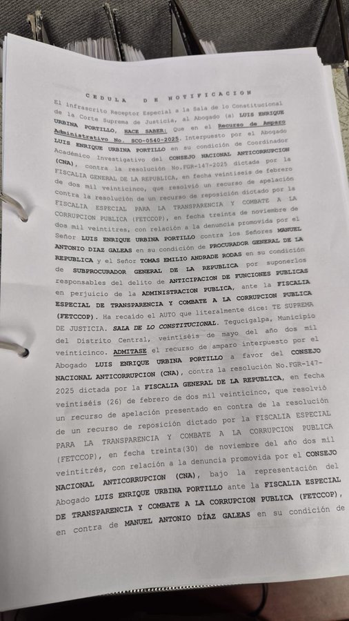 Tegucigalpa.- La Sala de lo Constitucional de la Corte Suprema de Justicia (CSJ) admitió un recurso de amparo presentado por el Consejo Nacional Anticorrupción (CNA), lo que reactivó el proceso relacionado con una denuncia contra el Procurador General de la República (PGR), Manuel Antonio Díaz Galeas, y el Subprocurador, Tomás Emilio Andrade Rodas.
