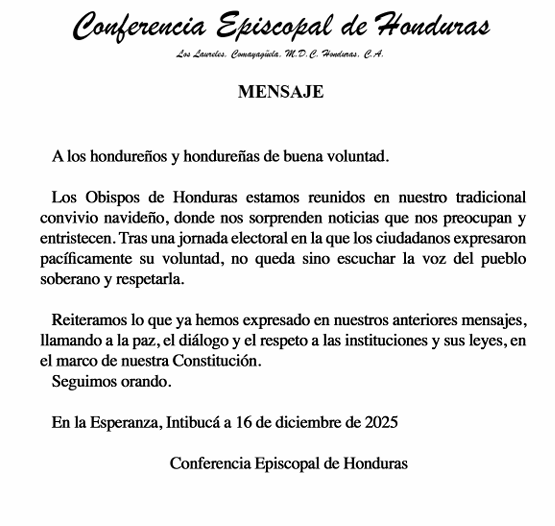Tegucgalpa.- La Conferencia Episcopal de Honduras instó este martes a los ciudadanos a respetar los resultados de las recientes elecciones y promover la paz y el diálogo en el país.