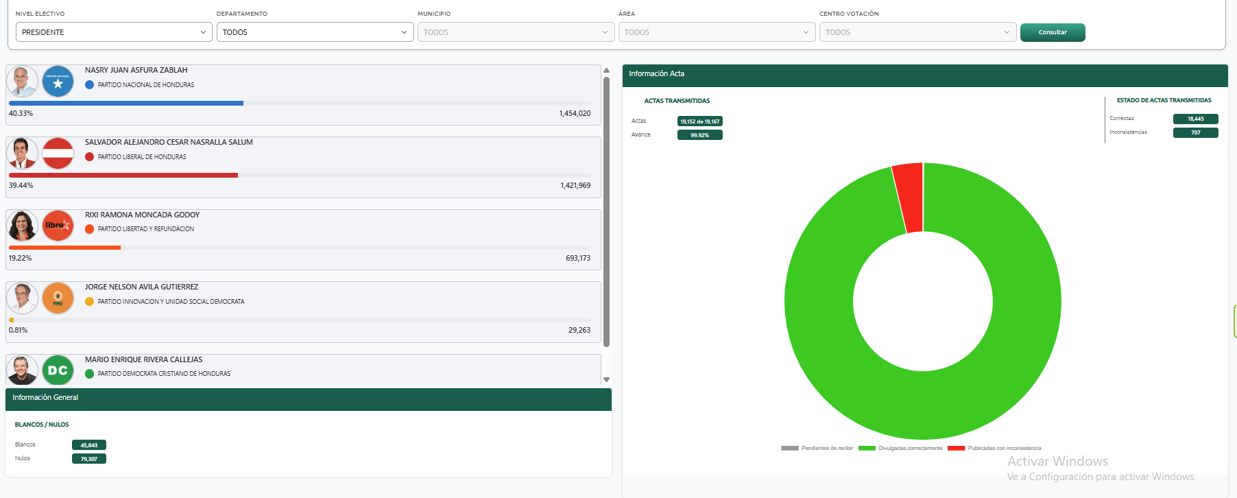 Tegucigalpa, Honduras.- Con el 99.92 por ciento de las actas transmitidas, el Consejo Nacional Electoral perfila como ganador provisional de las elecciones presidenciales a Nasry Juan Asfura Zablah, del Partido Nacional de Honduras, al registrar 1,454,020 votos, equivalentes al 40.33 por ciento del total.