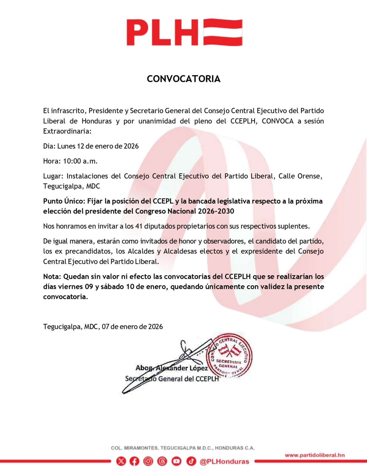 TEGUCIGALPA.- El Partido Liberal convocó a una sesión extraordinaria el lunes 12 de enero para definir su posición sobre la conformación de la nueva junta directiva del Congreso Nacional (CN), informó el militante liberal German Lobo, la reunión incluirá a todas las autoridades del partido y a los 41 diputados electos, tanto propietarios como suplentes.