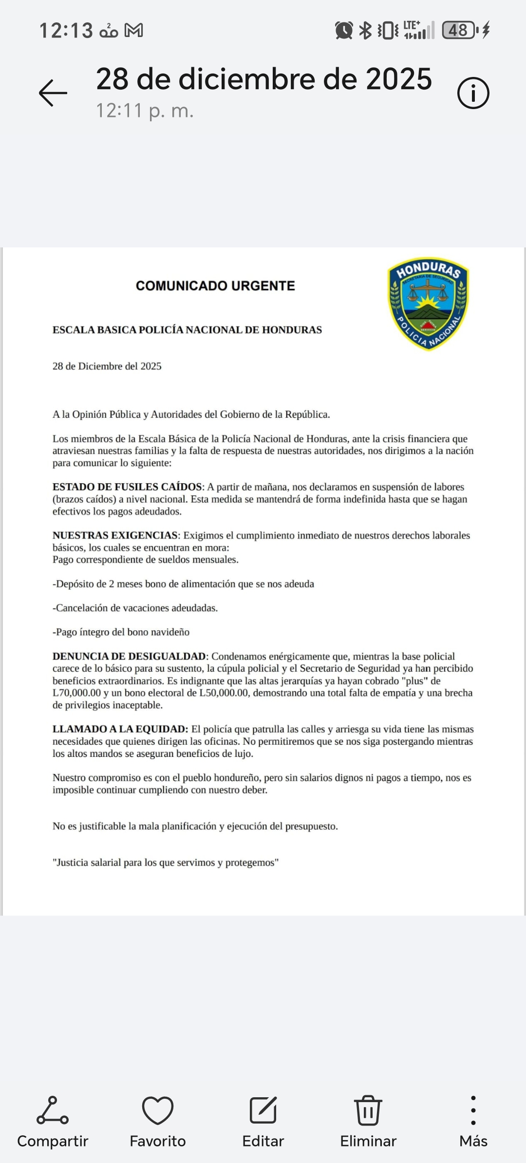 En el documento, la base policial también denunció una desigualdad interna dentro de la institución, señalando que mientras los agentes carecen de ingresos básicos, la cúpula policial y el titular de Seguridad ya habrían recibido beneficios extraordinarios, incluyendo pagos adicionales de hasta 70 mil lempiras y un bono electoral de 50 mil lempiras, situación que califican como una muestra de falta de empatía y una brecha de privilegios “inaceptable”.