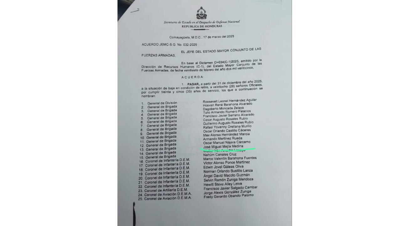 Tegucigalpa.-El jefe del Estado Mayor Conjunto, Roosevelt Hernández, junto a un grupo de 24 oficiales, dejará la institución el 31 de diciembre, tras 35 años de servicio marcados por polémicas y cuestionamientos públicos.